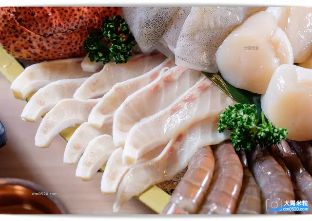 再來是中間的日本生食級大干貝/九洲鮑魚/頂級鱘龍魚/軟絲,這幾樣都是米粒最愛!