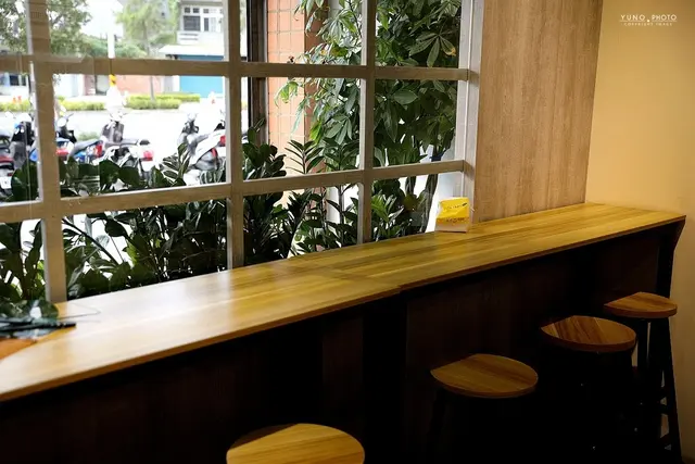 沿著窗邊擺放吧檯式長桌 與兩張五人桌
