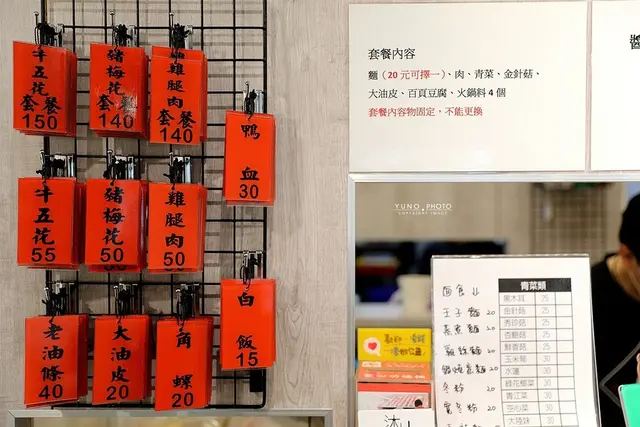 牆上的掛牌列有鴨血、老油條、牛五花、豬梅花、雞腿肉、大油皮、角螺、白飯....等單點選項可以挑選!