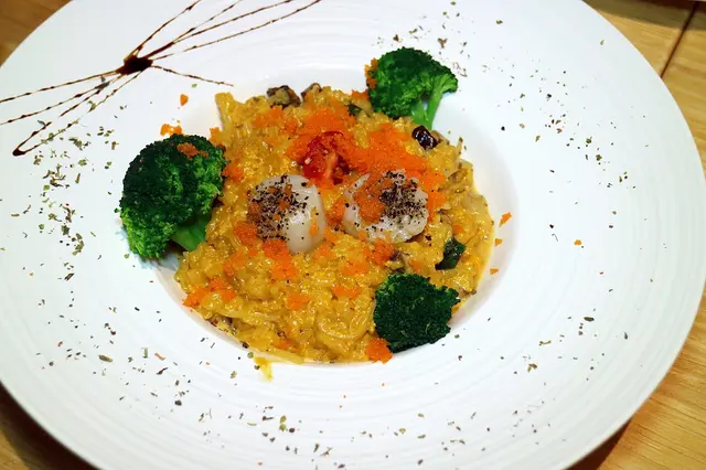 燉飯上頭兩顆炙燒干貝,干貝咬起來很軟嫩