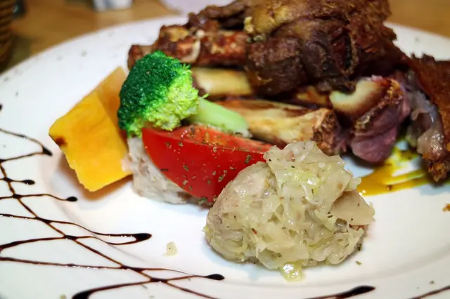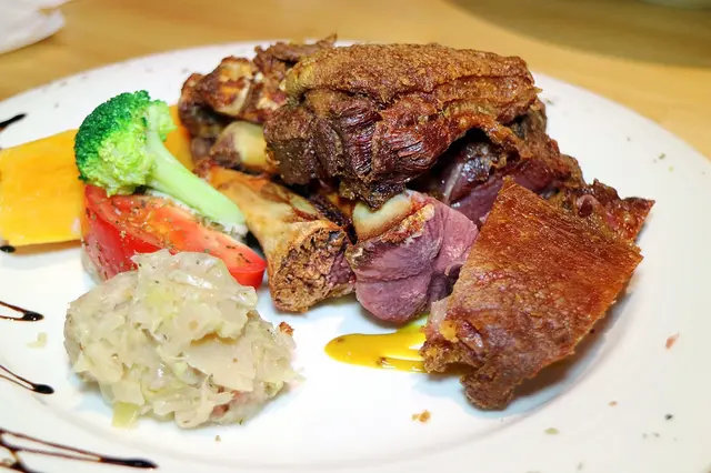怕吃多會膩的朋友可以搭配旁邊的配菜,烤豬腳就是要配酸菜