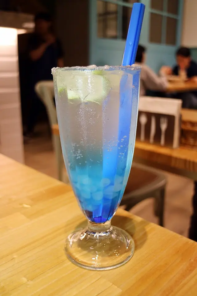 海洋之星的藍是使用藍柑橘下去製成,整體喝起來是氣泡飲的一種