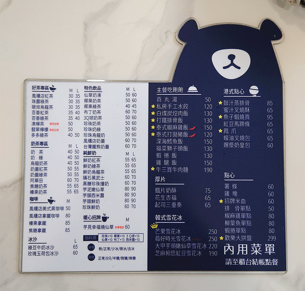 不過,風櫃店的菜單實在太可愛了,以黑熊為底....