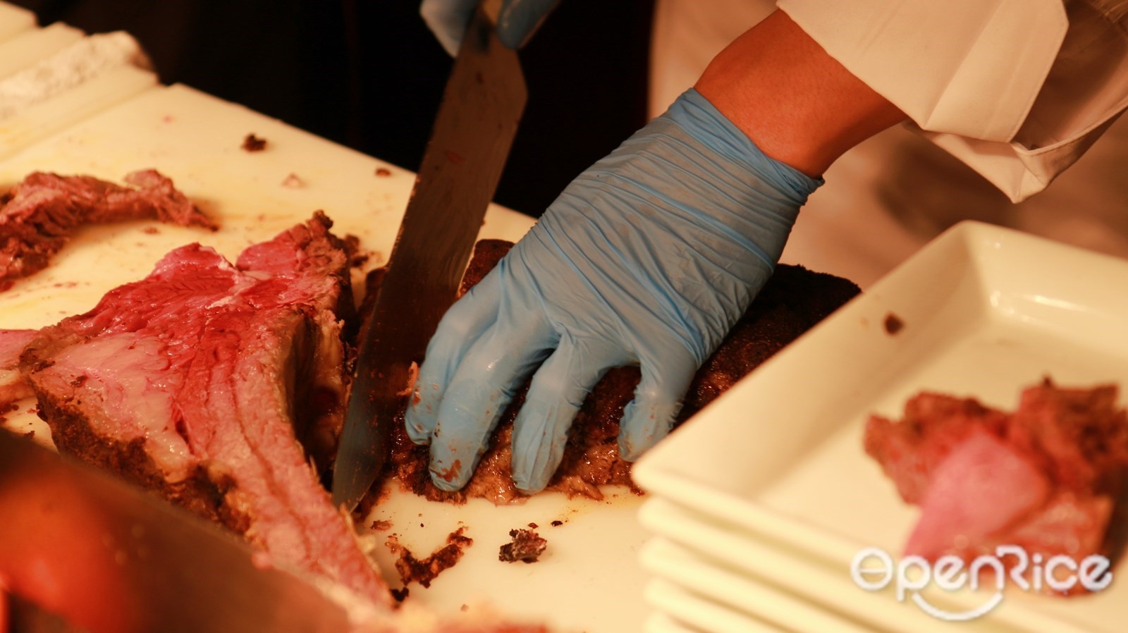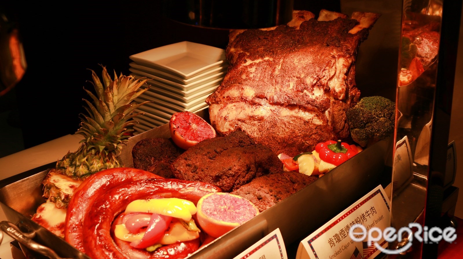 不只週末有主廚特選佳餚,平日期間主廚亦準備多種美式佳餚輪番上陣,「肯瓊煙燻辣粉烤牛肉」以經典美式炭烤料理手法製作而成,肯瓊(Cajun)香料是美國紐奧良地區的特有香料,結合了匈牙利紅椒、辣椒粉和多種香料打成粉末狀,用各式蔬菜、海鹽、胡椒等醃漬牛肉約6-7小時,再將肯瓊香料塗抹在整塊牛胸肉上低溫慢烤24小時,外表因香料烤上色如炭的牛胸肉,切開後卻是粉嫩色澤帶點油花,細緻柔嫩的牛肉邊上帶著肯瓊香料的鹹香味,著實是一道慢工出好菜的料理。