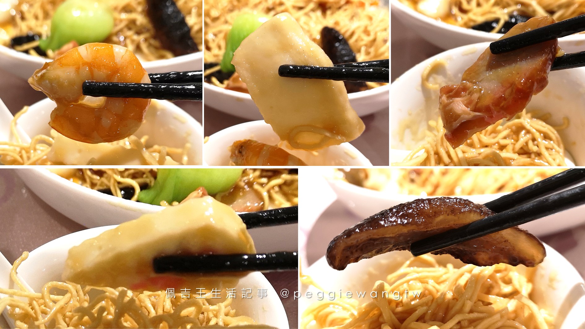 | 圖:草蝦仁、鮑魚片、叉燒、厚魚板、烏參(不是香菇XD) |