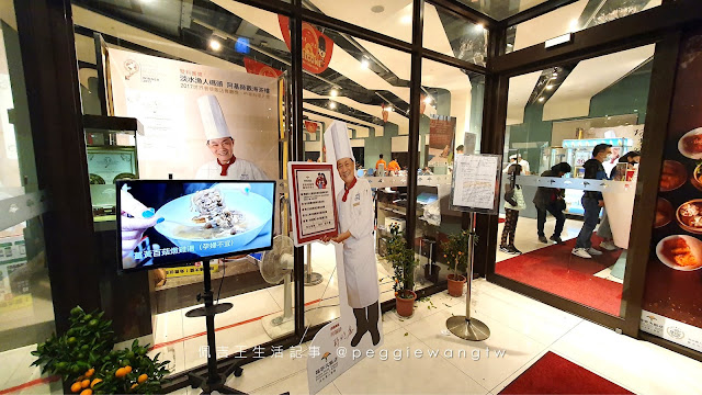 餐廳入口設計為兩層節能自動門設計,就是進入大門自動門後多一個空間,必須再往右方自動門進入餐廳內。待轉區(?)小空間裡的電視,正播放餐廳形象影片,還有阿基師等比高人形立牌歡迎你~థ౪థ