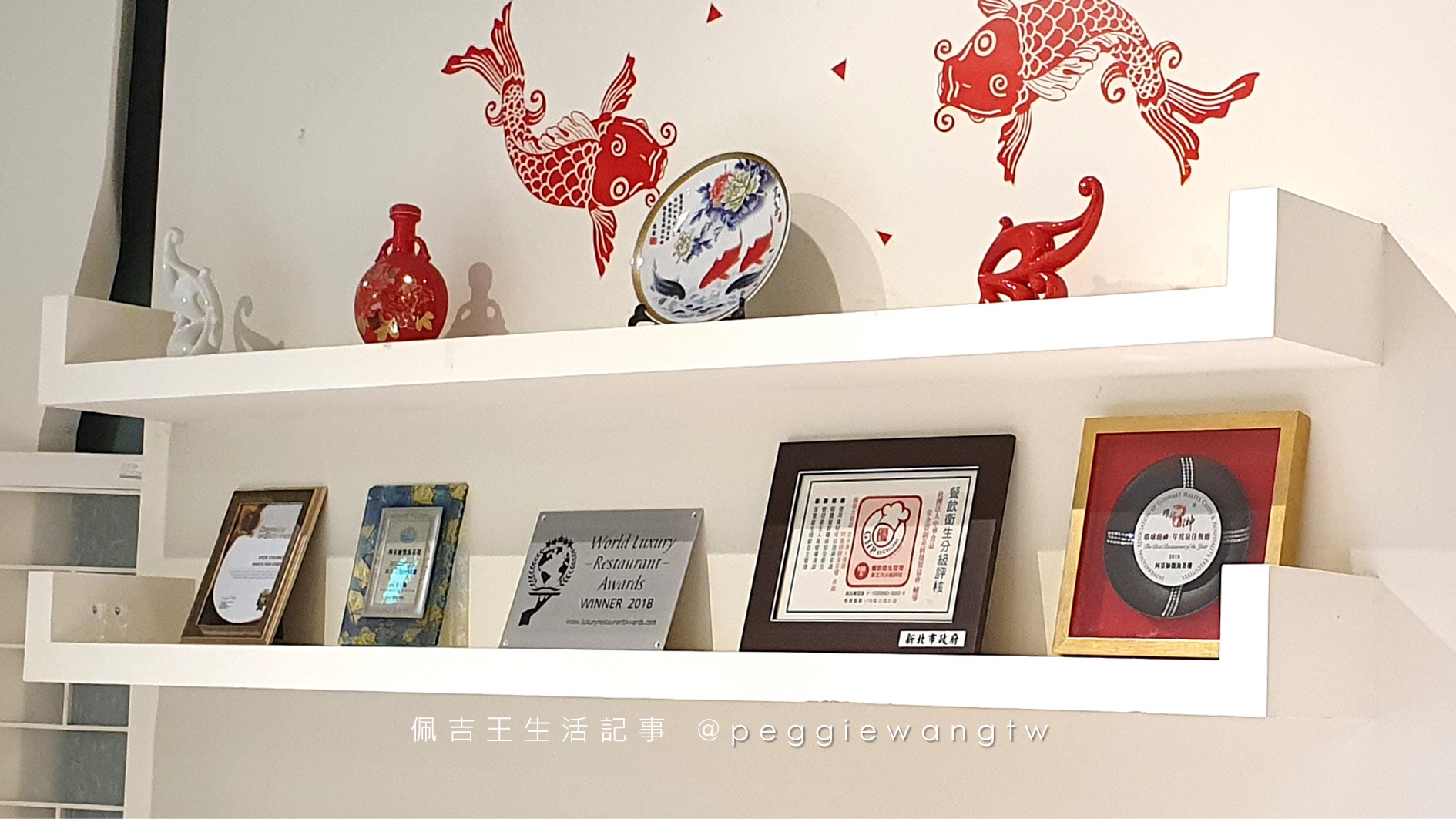 | 圖:櫃台後方擺放餐廳歷年所得獎盃獎牌及衛生證書 |