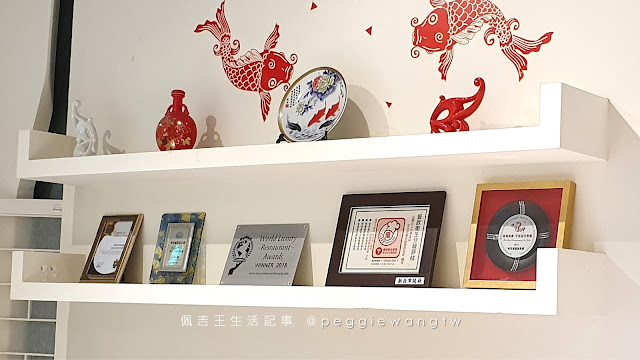 圖:櫃台後方擺放餐廳歷年所得獎盃獎牌及衛生證書 |