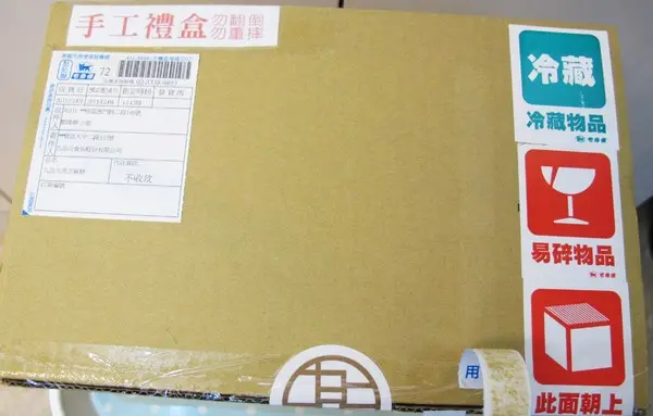 今天收到的『九品元。芝麻可可禮盒』包裹,上方貼滿『易碎物品』『此面朝上』的提醒貼紙