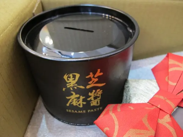硬紙盒的包裝,除了保護裡面的芝麻醬,還貼心地設計為『存錢筒』呢!