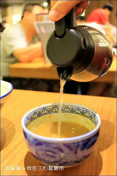 麵條吃完,可請服務生拿高湯,倒入沾麵醬汁中調和,高湯有著柴魚香味