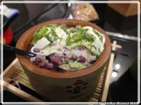 非常有誠意的分量,底層是抹茶剉冰,上層是香草冰淇淋淋抹茶醬,然後還有甜而不膩的軟綿紅豆及Q軟小湯圓。黃鴨子很愛這個木盆甜品,去了幾次都有他的出場戲份~