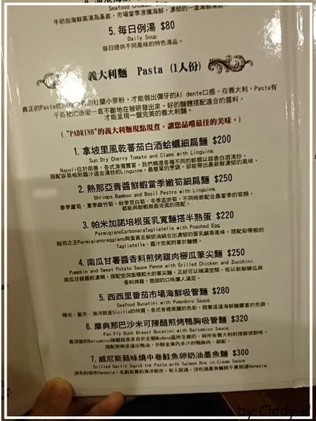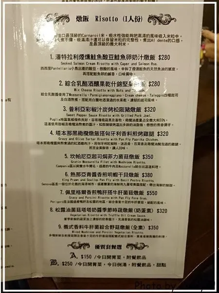 胡亂拍兩面MENU給大家參考一下,價格都是單點,可加150元或是250元升級套餐這樣。乍看之下會覺得以義大利麵來說不便宜,但上桌之後就覺得一切值得了,因為用料非常實在味道也很好啊!!