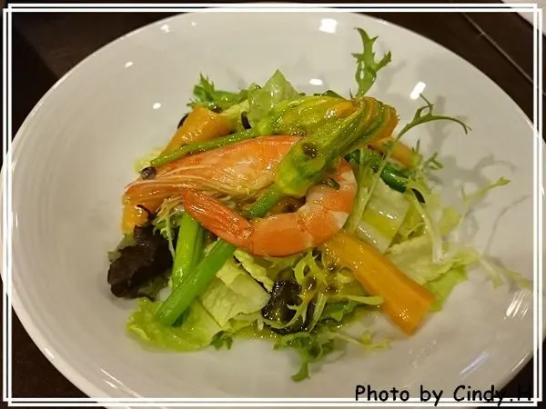 是橙汁油醋沙拉,生菜爽脆、蝦子大尾新鮮,澄汁味道也好得無從挑剔,不因為只是一盤附餐開胃菜而隨便做做,光這點就很加分~