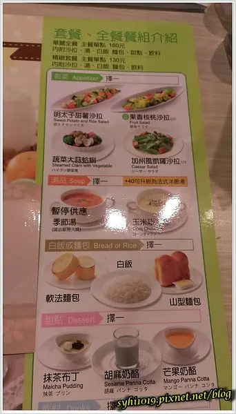 其餘包含沙拉、湯、(白飯、麵包,兩者則一)、飲料等項目!