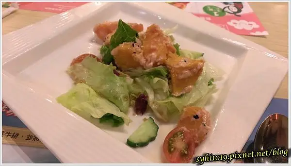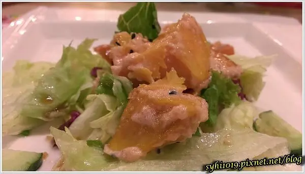 除了沙拉盤中常出現的生菜外,最特別的就是明太子甜薯啦!