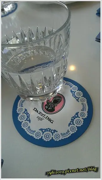來到座位區每杯水杯下也有著Dazzling Cafe的杯墊,杯墊裡頭圖案帶著蕾絲邊,就是公主風走向!