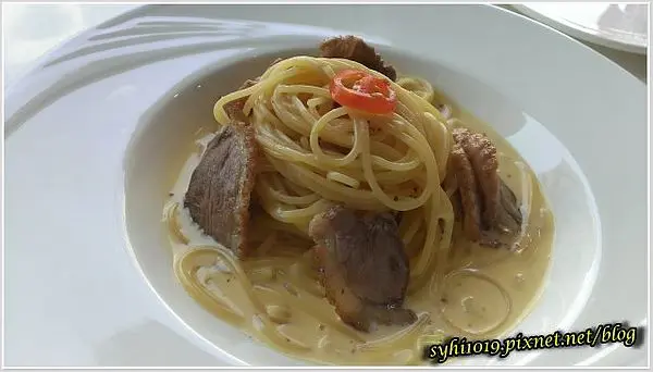 這是『辣味雞肉義大利麵』,要價240元,吃起來就像是三杯雞的感覺,辣中帶勁,非常台式的一道義大利麵料理!