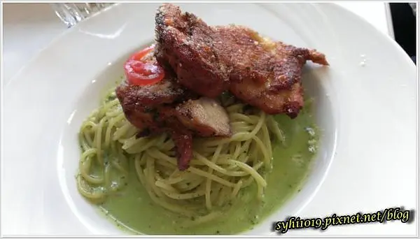 這是『青醬奶油雞腿麵』,要價240元,怕吃不夠的人可以點這一道,雞腿肉是相當夠份量的!