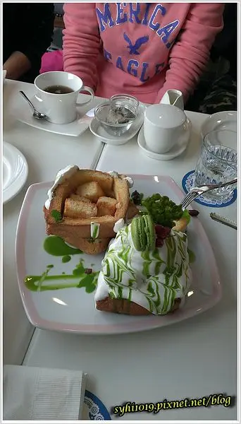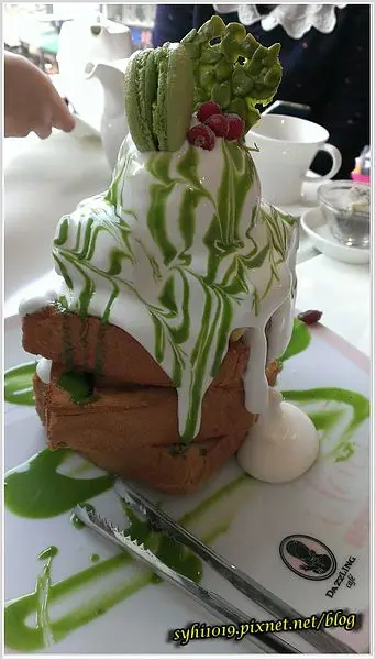 土司是層層堆疊的組合上頭淋上奶油與冰淇淋的雙重口感,再淋上抹茶醬,上頭點綴著馬卡龍、餅乾與果粒就完成了這項藝術品!