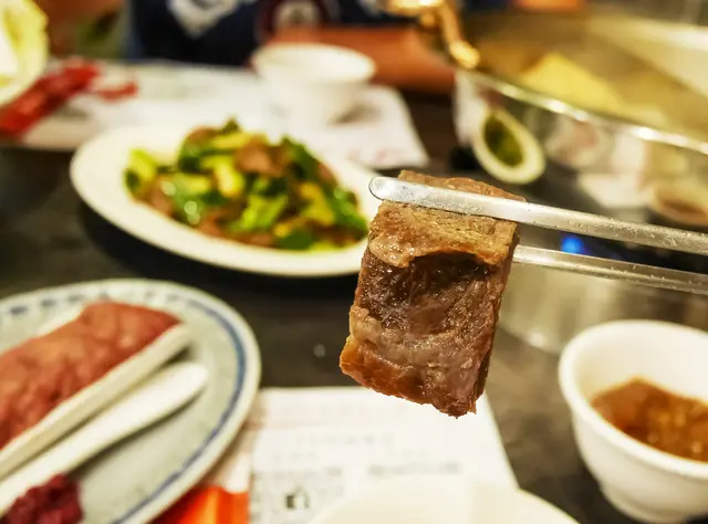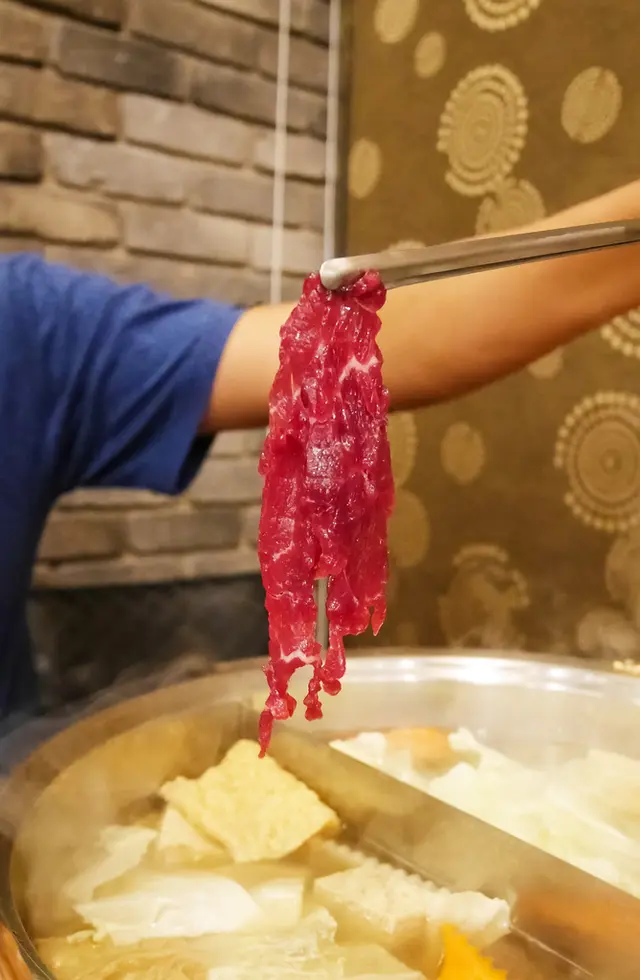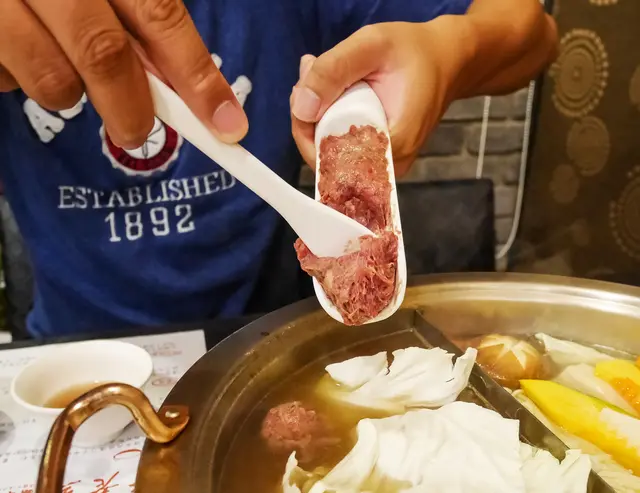 (2)將生牛肉置放於鐵勺中,在熱湯中輕涮絆攪個四、五下即可食用。