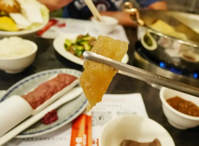 牛筋:分成兩個層次,一面軟Q且入口即化,另一面稍有軟骨口感,層次分明。女孩子最需要的膠原蛋白都在這裡,且牛筋部位不含脂肪、膽固醇較低,因此是火鍋的絕佳配料之一。