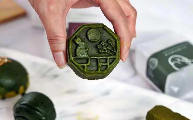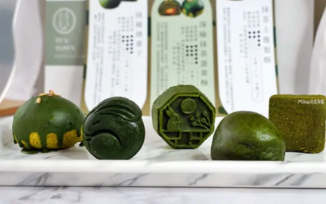 這一款是抹茶濃度最高的月餅,建議放在最後再吃!原形來自冰心綠豆糕,抹茶濃度真的極高,看那個抹茶原生葉綠色就知道了,超深綠。