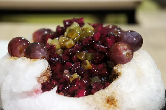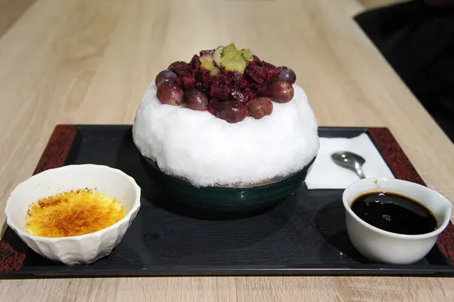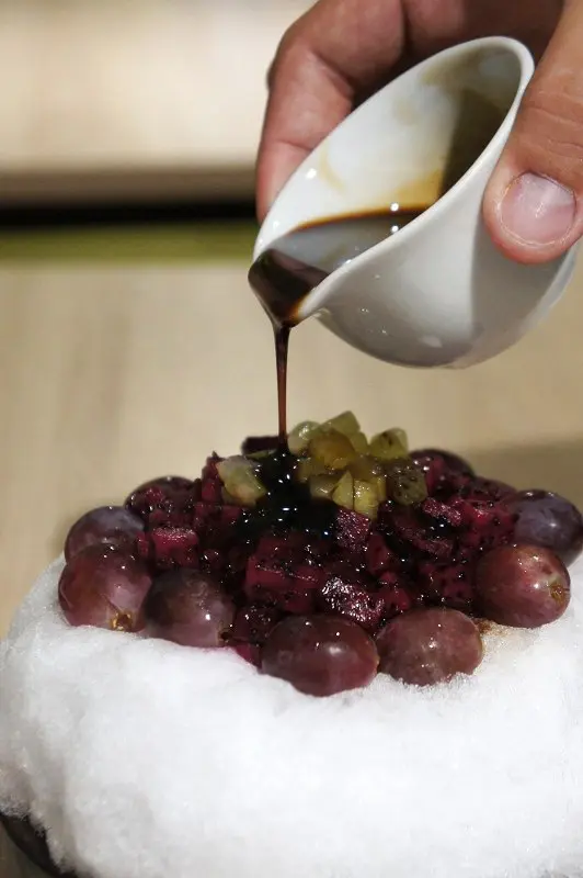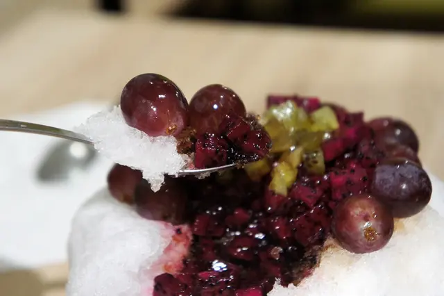 刨冰有如雪片般柔細,一入口就化開了,跟一般傳統刨冰粗粗的口感很不一樣,結合水果跟黑蜜是酸酸甜甜的滋味