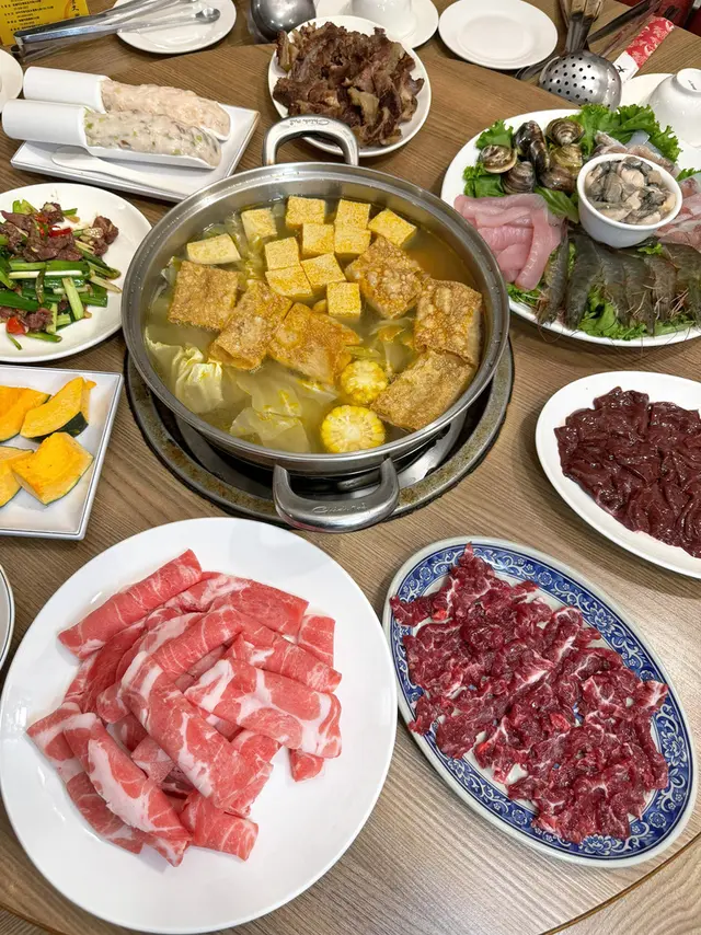 我們點了大鍋底、五花牛肉、牛肝、梅花豬、干貝漿、蝦仁漿、蔥爆炒牛肉、牛腩冷盤、海鮮拼盤、凍豆腐和南瓜。