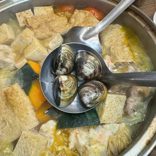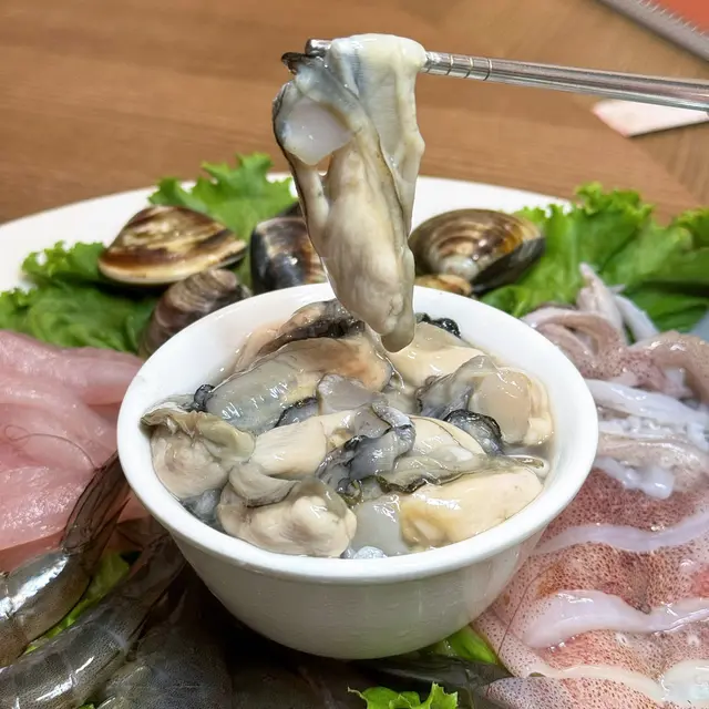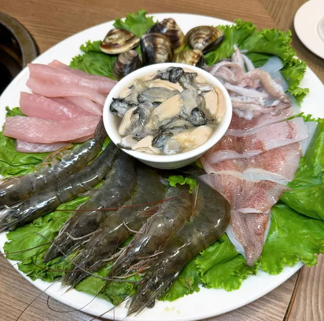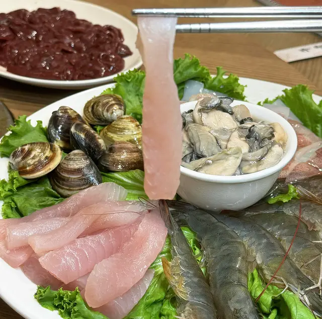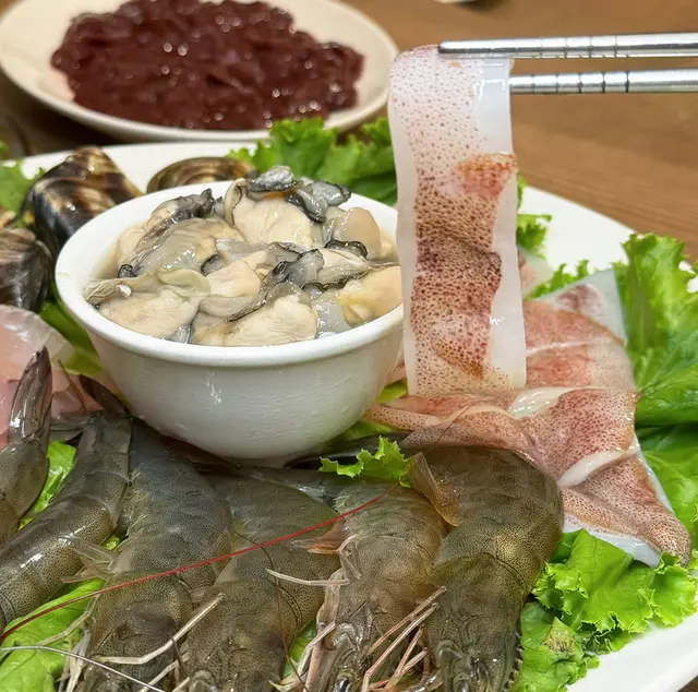 澎湃的海鮮拼盤😍有白蝦、蛤蜊、蚵仔、花枝、虱目魚柳,搭配牛肉鍋一起涮煮,就是鮮啊!!