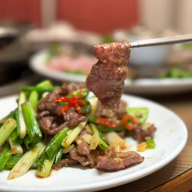 牛老大不只有火鍋也有熱炒,一次滿足火炒兩吃!蔥爆炒牛肉以青蔥、薑、蒜、辣椒爆炒而成,牛肉香氣十足,口感鮮嫩多汁,下飯好料!