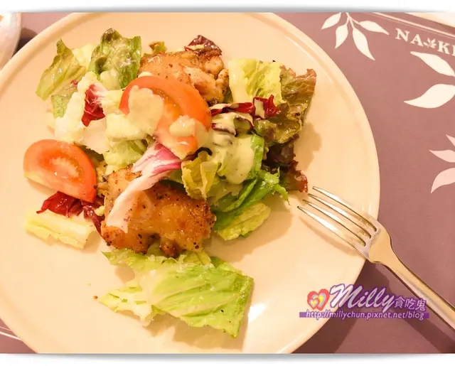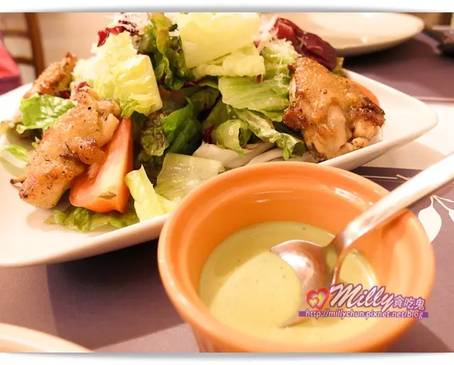 沙拉一佐上凱薩羅勒沙拉醬,感覺這青醬非常清爽跟一般醬料不同