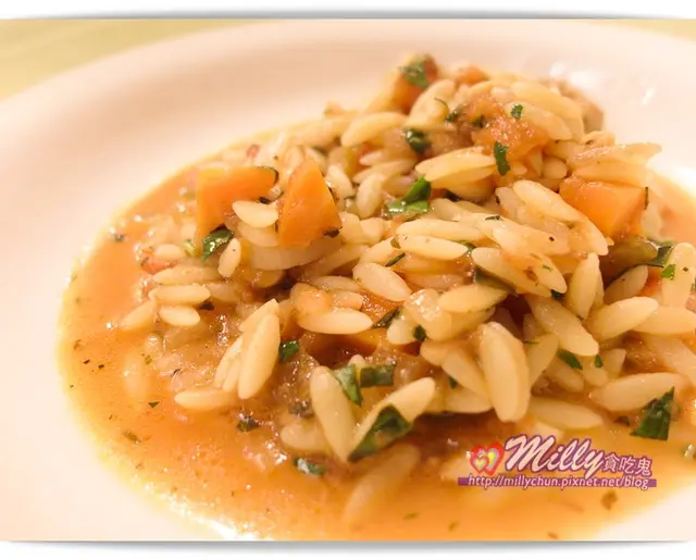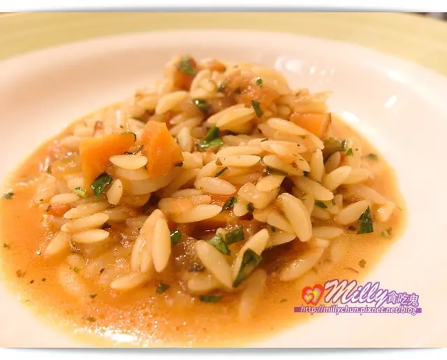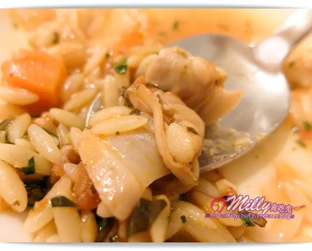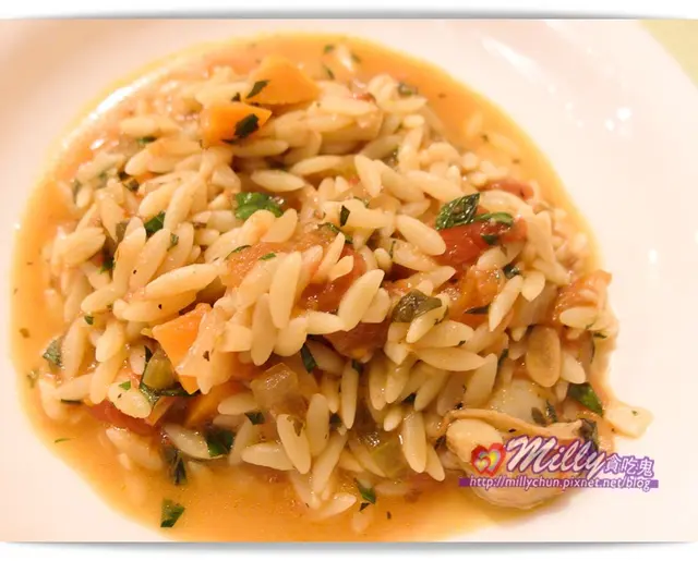 這次品嘗是蛤蠣菌菇番茄米麵,這是Milly第一次吃到米麵(它是義大利麵但形狀很像米粒狀)