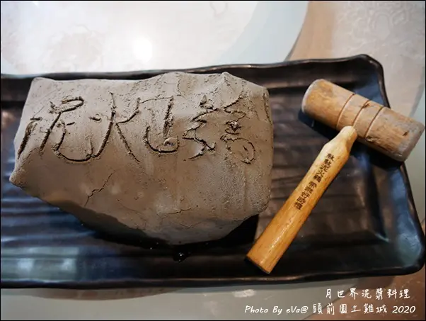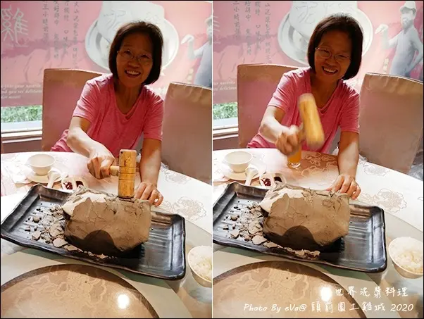 泥火山雞上桌後,店家會先讓我們拍照,我爸就很認真也很小心的在敲,怕敲的滿桌都是土