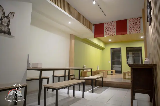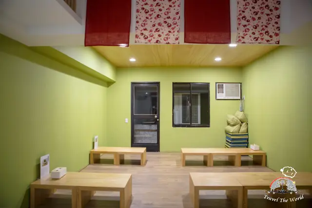 夜晚的冰屋,圓滾滾的燈飾,昏暗的光線,裡面為日本風。