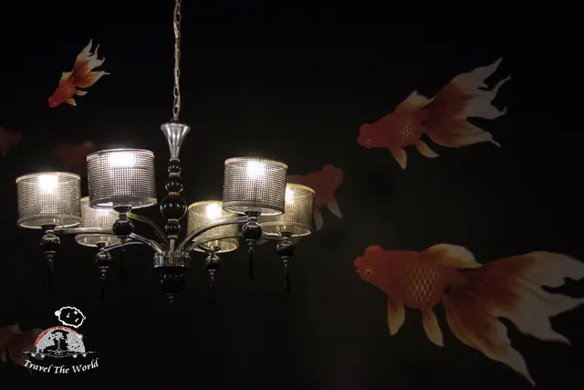 遨遊的金魚與水晶吊飾,帶有美感。