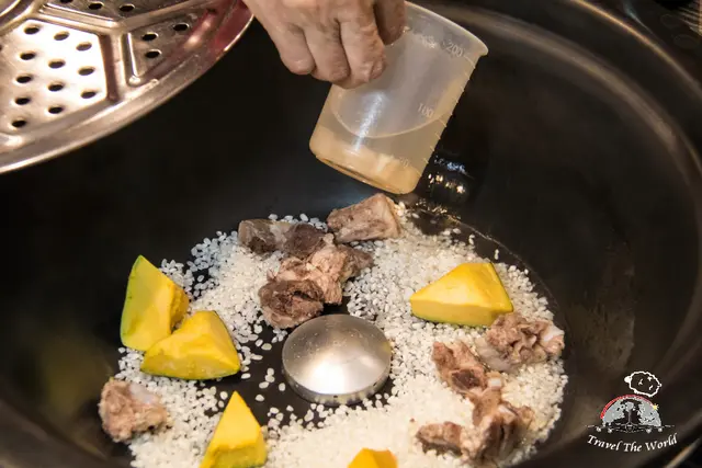 米、南瓜、豬骨,倒入干貝高湯。