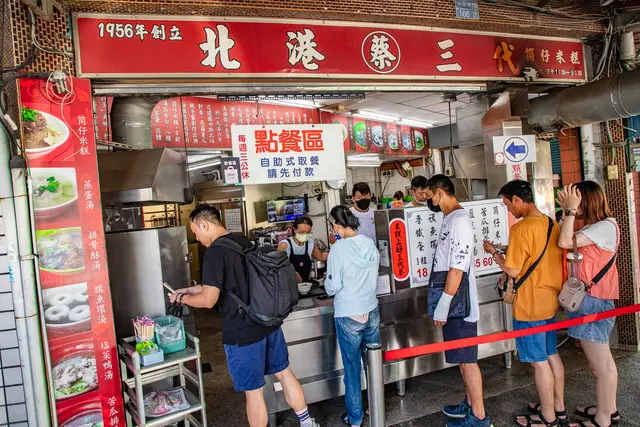 北港蔡三代筒仔米糕就在愛河旁的河西路上,路邊有不少停車格可以利用,到北港蔡三代筒仔米糕用餐要有排隊的準備,果不其然我們一到現場就是大排長龍的景象,不管內用外帶都要先排隊