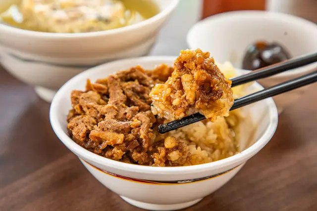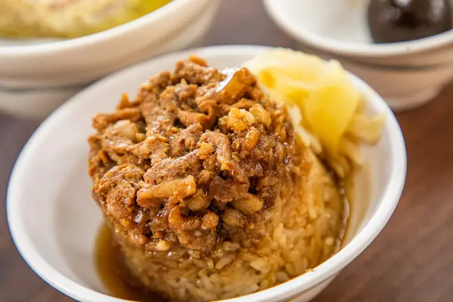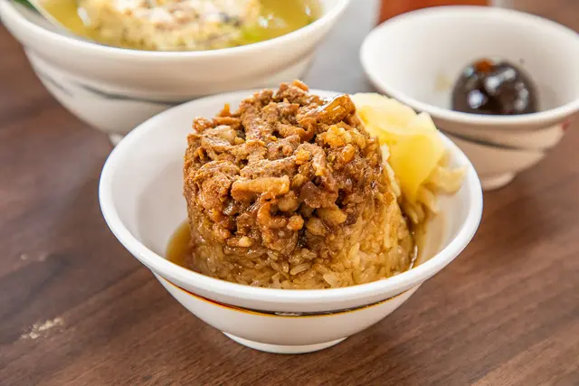 筒仔米糕,這的米糕是口感偏軟糯的那種,上面有肉燥跟肉條,旁邊再附上嫩薑,因為上面有肉燥跟肉條,而且肉燥跟肉條給的算多,加上滷汁後米糕的口感更加濕潤夠味,基本上不用沾醬也很好吃