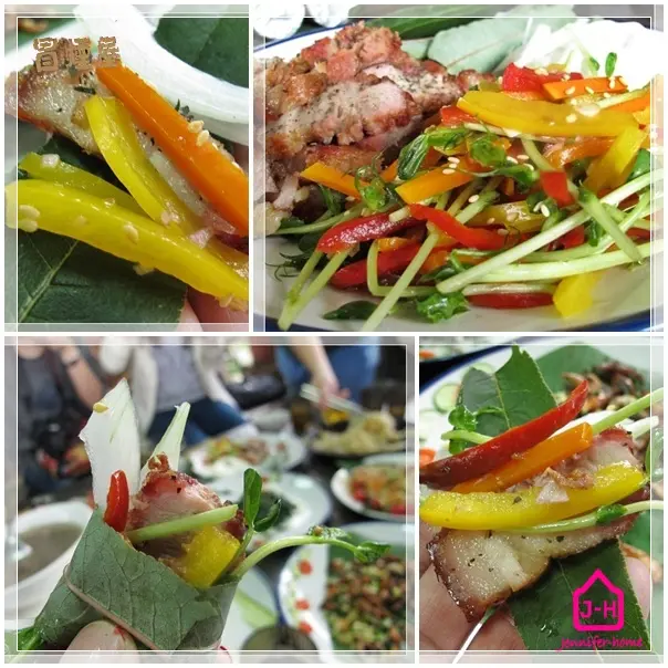 醃肉用香思木烤熟後切片配著洋蔥絲彩椒絲和小豆苗一起吃,清爽的口感吃不到豬五花的油膩