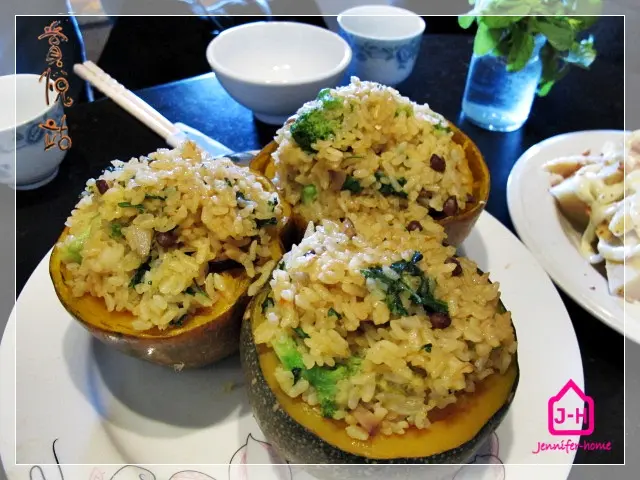 南瓜飯直接放在新鮮南瓜裡蒸,吃的同時也能吃到大塊的南瓜肉塊