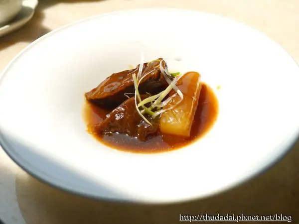以不過於鹹甜的紅燒煮汁燜燉,化開的油質蘊含在內,