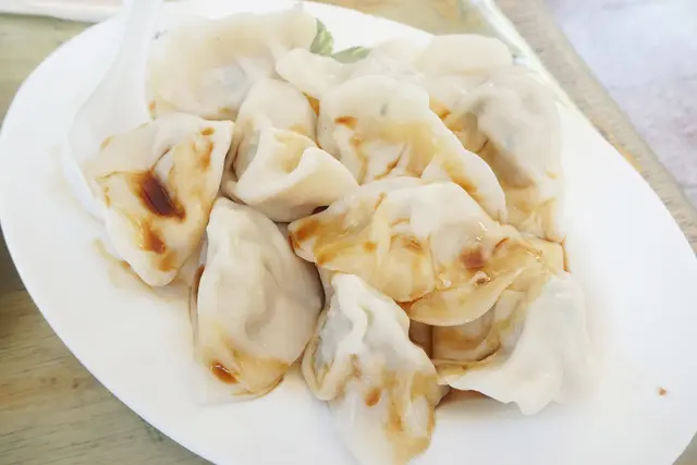 水餃&煎餃一顆4元,簡單的醬料。水餃餅皮Q彈內餡蠻清爽的飽滿度也夠,香味算偏清淡但還不錯吃,他們家的水餃很多人在網購哦!