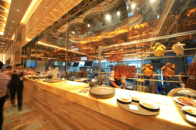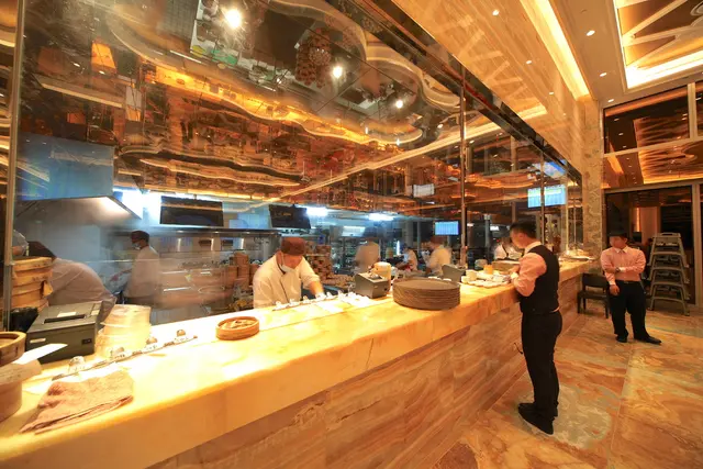 這裡面是廚房透明的大片玻璃可以看到廚師忙碌的場面,出菜的檯面全部都是使用高級的石材做成的。