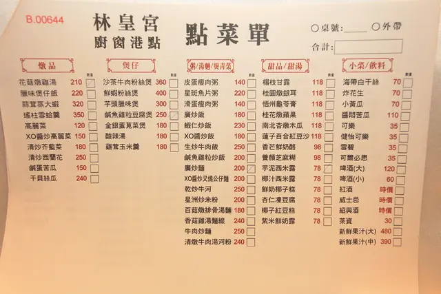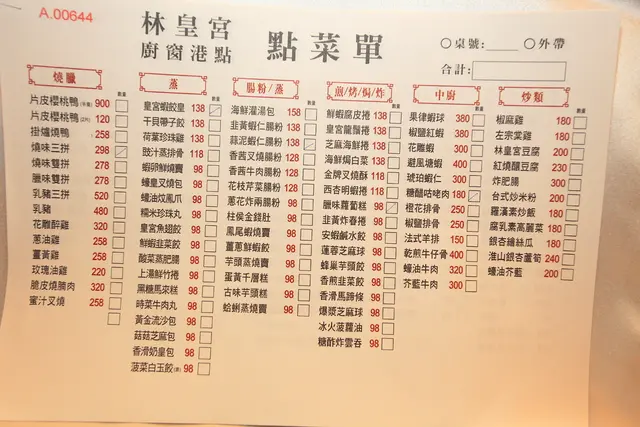 如果您還是不習慣使用ipad點餐也可以選擇紙張的點菜單,餐點的分類相當完整很容易來選取喜歡的菜色,小高朋友點燒味三拼298元、皇宮蝦餃皇138元、蒜泥蝦仁腸粉138元、臘味蘿蔔糕98元、糖醋咕咾肉180元、花菇燉雞湯210元、鮮蝦粉絲煲400元、廣炒麵200元與芋泥西米露78元等菜色。