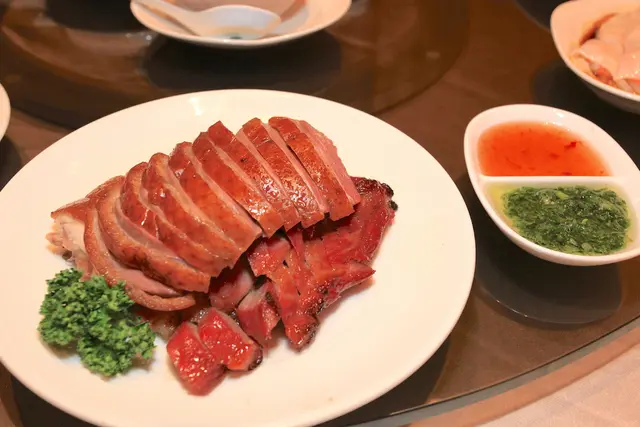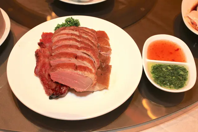 選用養殖三個用的櫻桃鴨以廣式掛爐的方式的做法,有別於片皮鴨的口感,烤鴨外皮酥脆肉質厚實軟嫩上面鴨皮油脂豐富非常好吃。