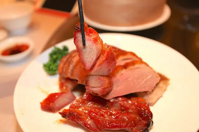 使用梅花肉部位肥肉與瘦肉的分布更均勻,搭配獨門醬汁均勻裹在豬肉上面呈現鮮紅色。