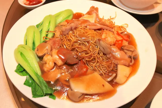 這盤廣式炒麵份量很大裡面的配料豐富勾芡顏色偏深。