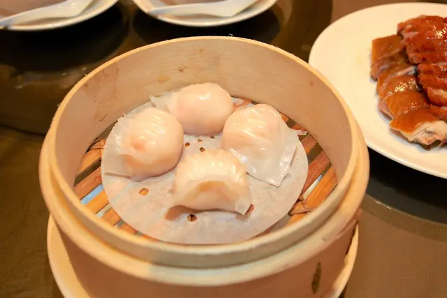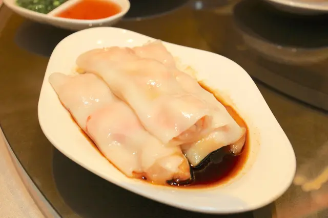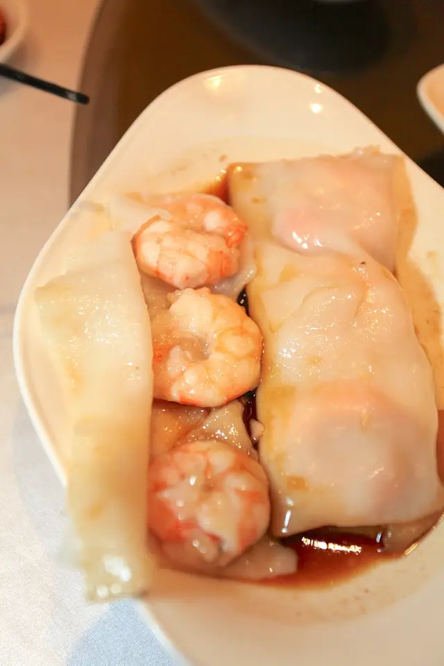 腸粉外皮非常重要一般使用再來米與太白粉著作而成的,盤中有三大條包裹中鮮蝦的腸粉淋上店家的特調醬汁。