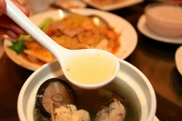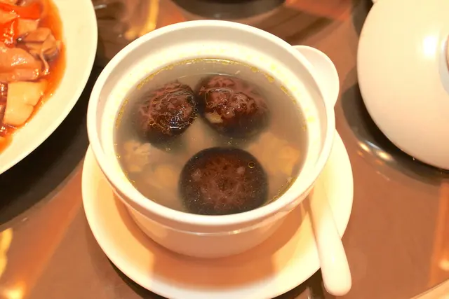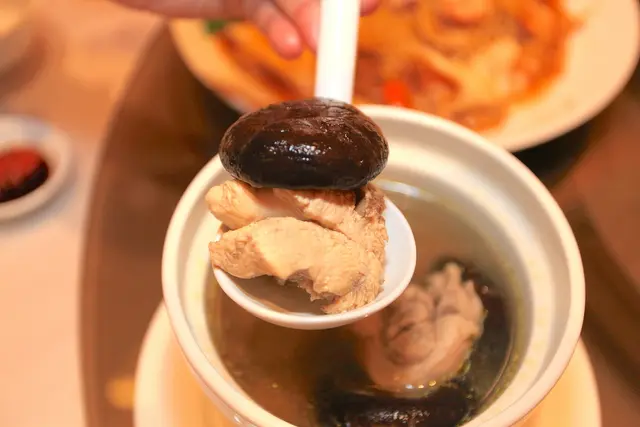 這碗花菇燉雞湯份量足夠兩人品嚐打開飄散出香菇香氣。